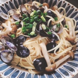 オリーブオイルでにんにくときのこを炒め、冷凍しじみと酒を加えて蒸し煮にします。